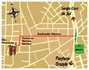 Siga pela rua principal, Andrade Neves, dobre na esquina do Banrisul, a esquerda, Rua Mateus Simões e na segunda rua à direita estará na Rua São Francisco.